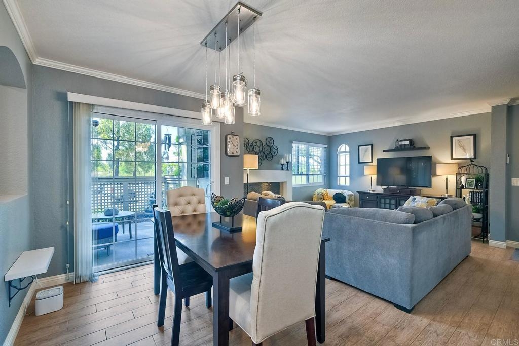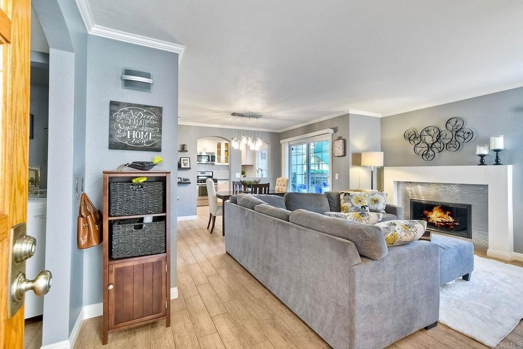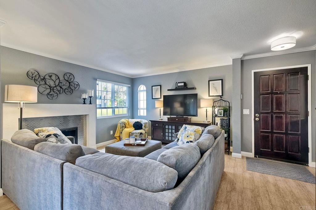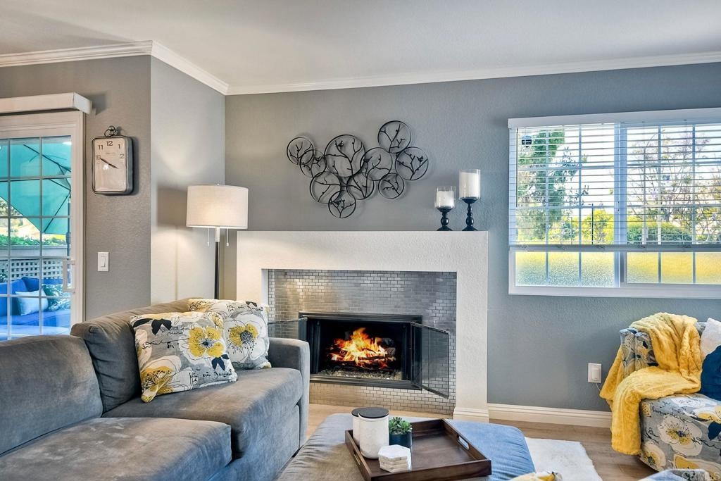 End unit ground level home offers crown molding and tile throughout home,quartz counters in kitchen built-in microwave gas appliances,washer and dryer in the unit,custom builtin-wardrobe cabinet in master closet,central air and heat dual paned windows,fireplace in living room,fenced yard close to fwy,shopping beaches.