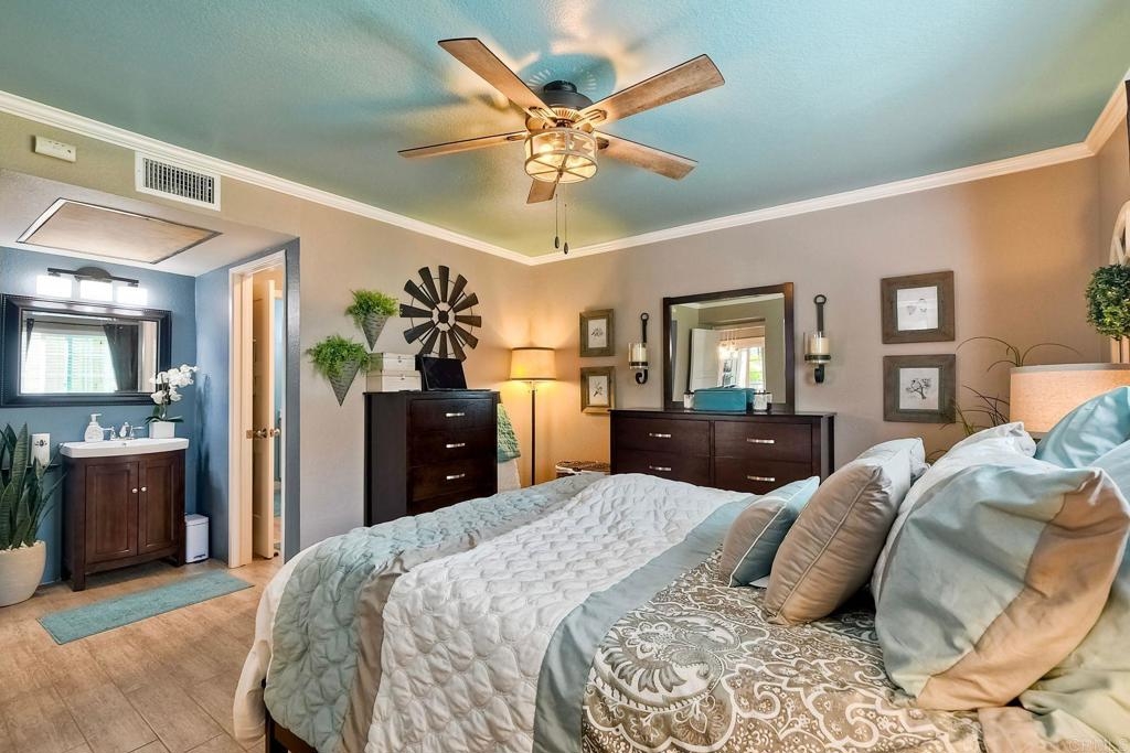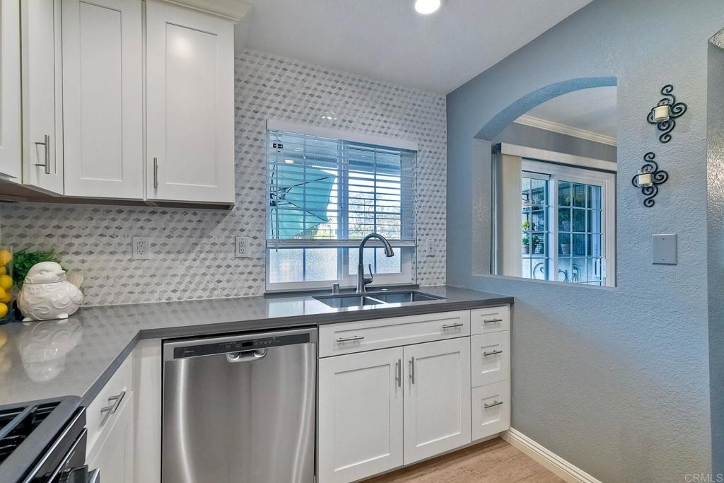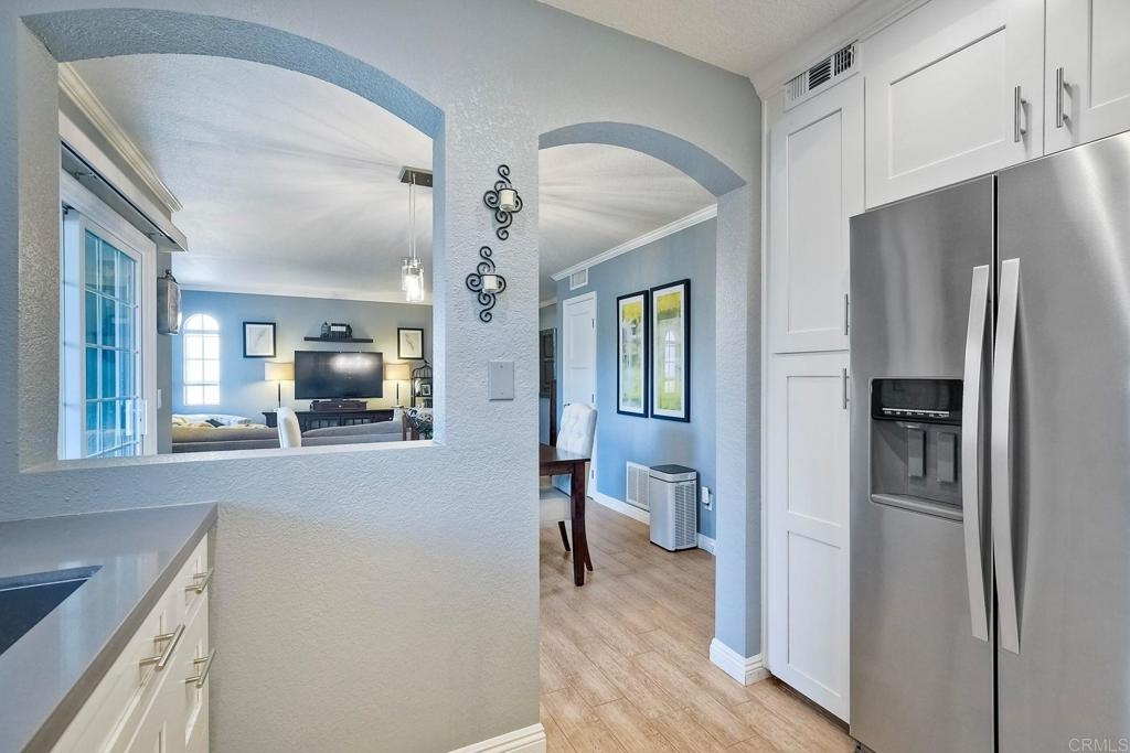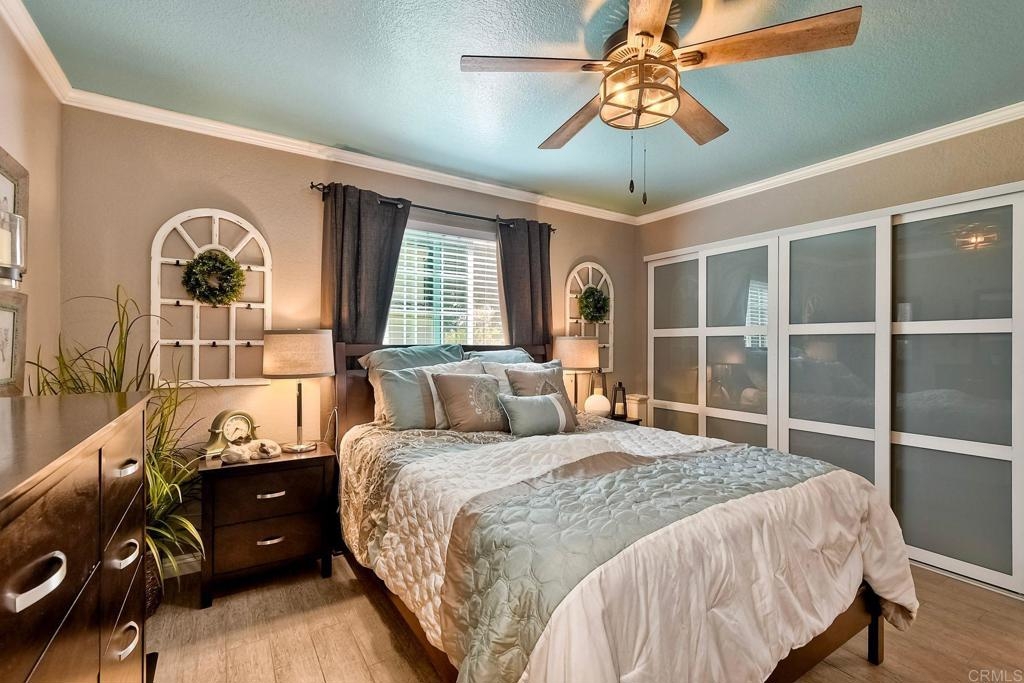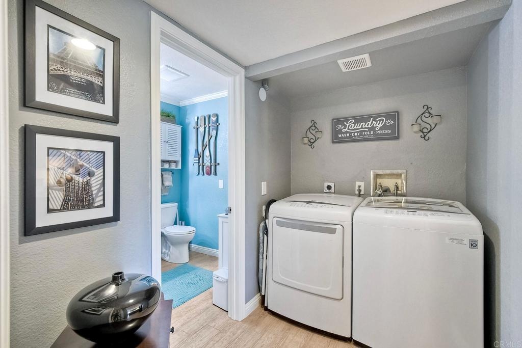 End unit ground level home offers crown molding and tile throughout home,quartz counters in kitchen built-in microwave gas appliances,washer and dryer in the unit,custom builtin-wardrobe cabinet in master closet,central air and heat dual paned windows,fireplace in living room,fenced yard close to fwy,shopping beaches.