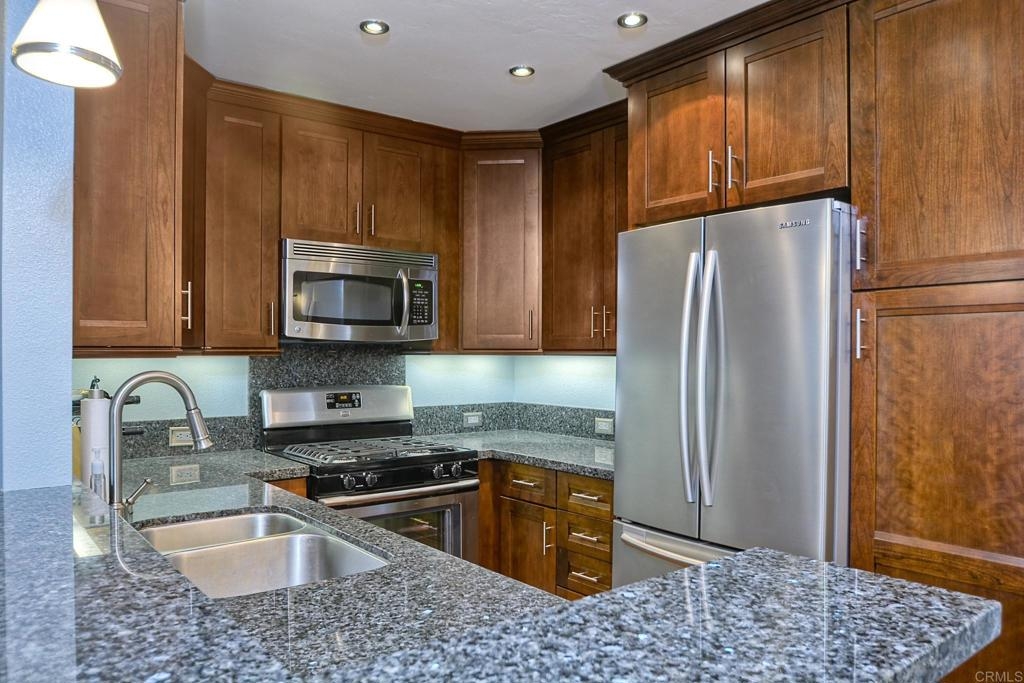 Incredibly updated home in the fantastic Shadowridge Aspens. Gorgeous Brazilian cherry wood floors. Private patio conducive to indoor/outdoor living can be accessed from the living room or bedroom, and expands your living space immensely. Kraftmaid kitchen cabinets & stainless steel appliances. Blue pearl granite slab countertops to impress. Stackable washer/dry and refrigerator all convey. Home has been painted a neutral beige since these photos were taken. New HVAC incl compressor less than 2 yrs old. 1 car garage #16 is very near the unit. HOA recently re-paved, and building was just fumigated on 7/30/24! Close to shopping, restaurants, etc. Minutes to thriving Vista & Carlsbad Business Parks which also house many local microbreweries. Shadowridge Golf Club located across the street!