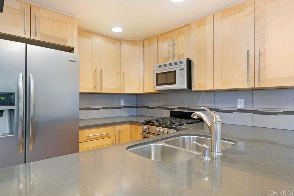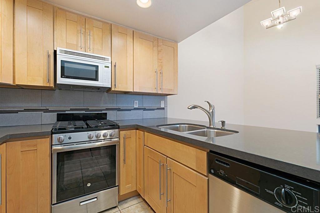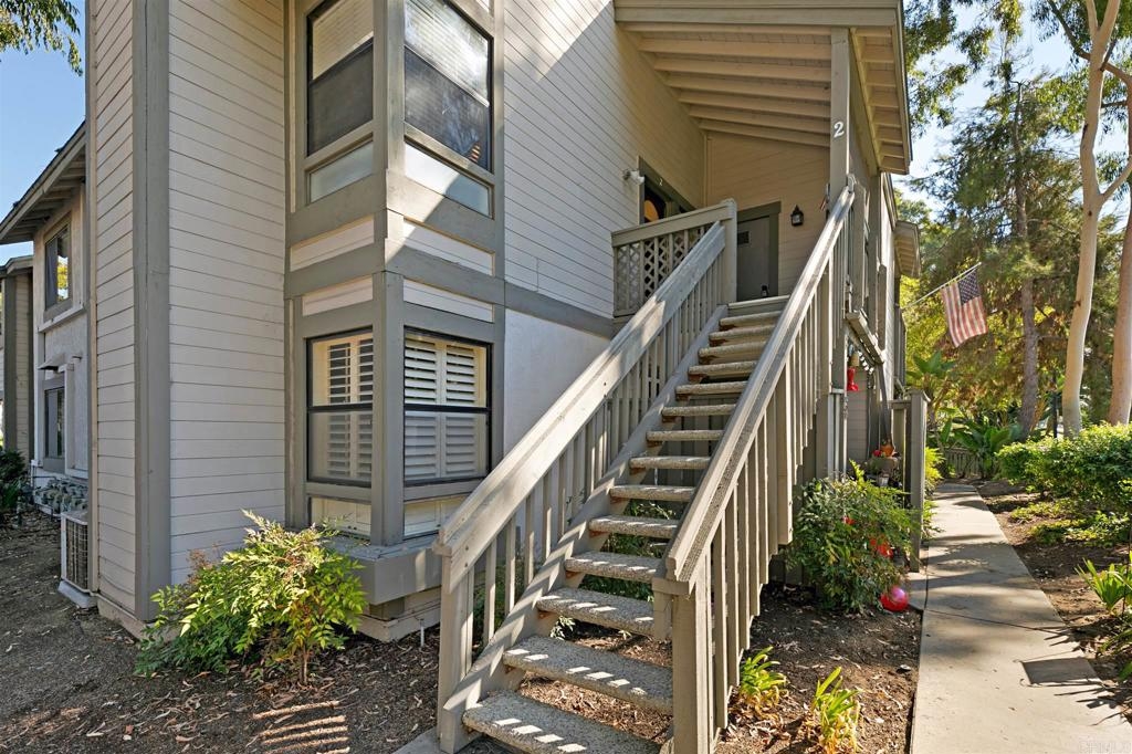 Highly sought-after upper corner unit in pristine condition! This freshly painted beauty offers a spacious living/dining area enhanced by vaulted ceilings and a cozy fireplace flanked by windows on each side. The remodeled kitchen opens to the dining area w/eat-at counter, SS appliances, a near-new stove/oven, contemporary light wood cabinets w/corner Lazy Susan and quartz counter tops. The remodeled bathrooms boast gorgeous tile and vanity sinks. Custom closet organizers have been installed in both wardrobes in the master suite. Special features include an inside laundry with full-size washer & dryer (included in the sale), large porch adjacent to the storage room/utility closet, beautiful laminate flooring and custom baseboards throughout, ceiling fans in living room and master suite so much more! Steps to the pool & Spa. Close to shopping, restaurants, the golf course, University and beaches