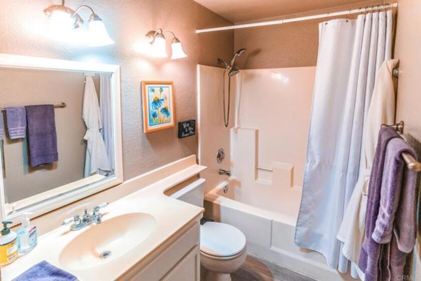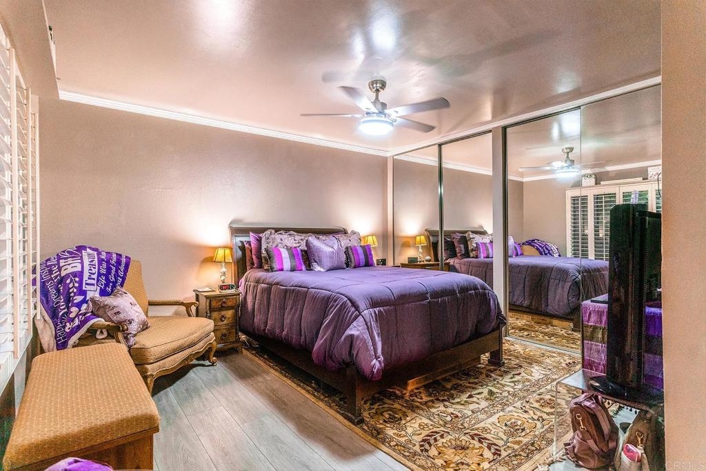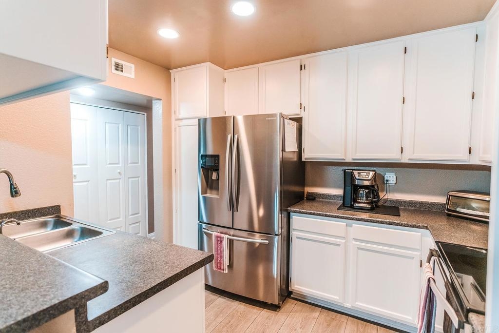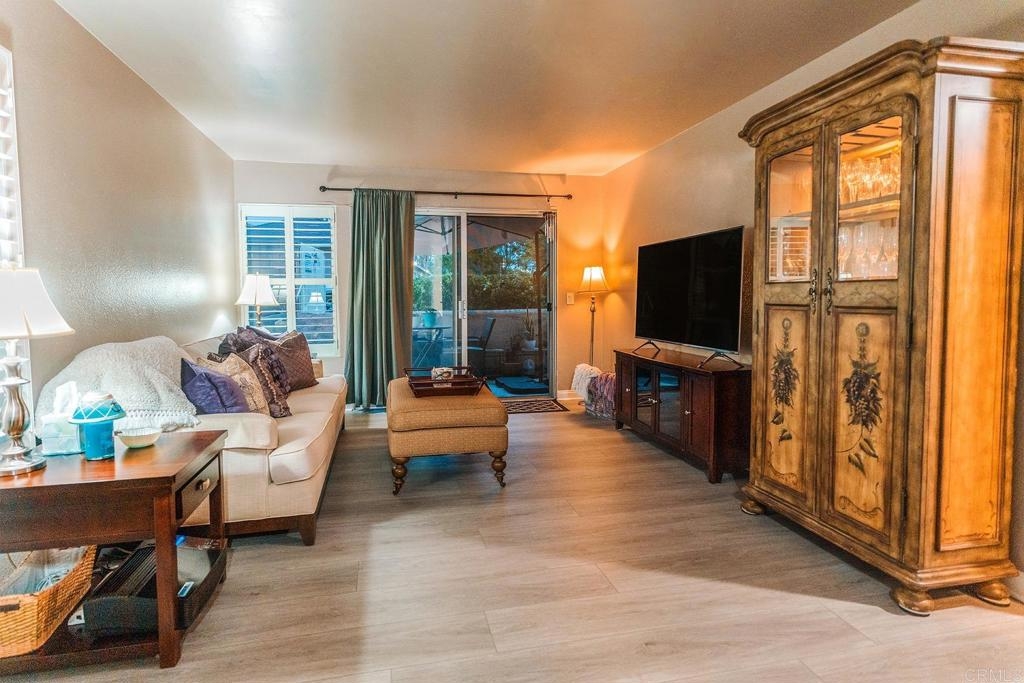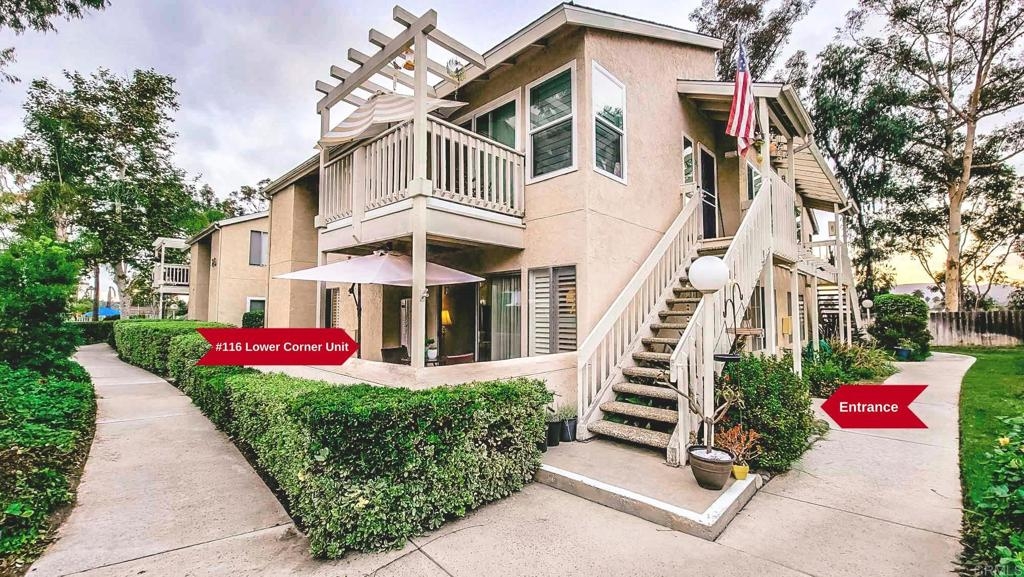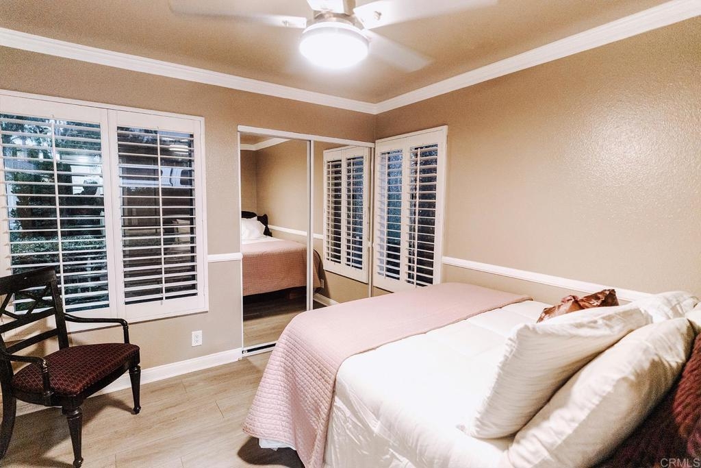 This beautiful 1-story, 3-bedroom, 2-bath condo boasts 1,116 sq ft of comfortable living space and is situated as an end-corner unit in the much-desired part of the community. Step inside, and you'll be greeted by new vinyl plank flooring, crown moulding in the bedrooms, and white interior shutters throughout. The kitchen features stainless steel appliances, a bar-high counter, and a dining area where you can enjoy nature through the large window. The condo features a full-size laundry closet with a new washer and dryer inside the unit, a private patio where the great outdoors can be enjoyed. On the warmer days of the year, enjoy the AC and ceiling fans found throughout the condo. The new roof was replaced in 2021 and the gym has recently been outfitted with new workout equipment. The condo is perfectly positioned near the pool, tennis courts, and other amenities that boast active lifestyles: spa, gym, clubhouse large grassy areas, and hillside grounds. And it's PET FRIENDLY! Parking is a breeze, with nearby assigned parking space AND 1-car garage. Located only minutes from downtown vista, access to the 78 fwy, and only a short drive to the beach!