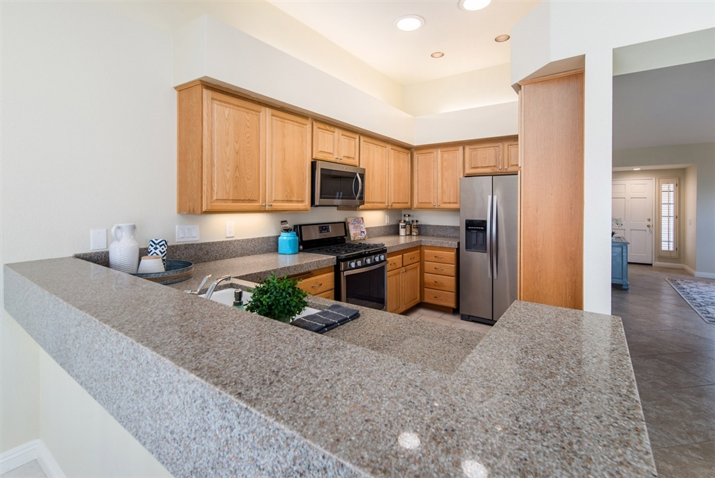 Welcome to your private retreat with the best golf course view in the community! Feels like a single family home with only 1 direct neighbor. Notable features include new low maintenance tile flooring throughout, new baseboards, fresh neutral paint, dual pane windows, new hard surface counter tops in the kitchen, new stainless steel appliances, upgraded gas log fireplace, inside laundry, all copper plumbing, upgraded garage opener with remotes. Quiet community offers residents pool & spa. (See supplement) Home has been extensively updated within the past 2 years including new flooring and baseboards, new window treatments in the family room and kitchen, new hard surface counter tops in the kitchen and all new appliances, new gas log insert was added to the family room fireplace. Entire home has been re-plumbed with copper piping. Dual pane windows and sliding glass doors insulate the home from the external temperature changes as well as any outside noise. Master retreat has private access to the patio and its own en-suite bath. Additional bath and full bedroom are perfect for guests. Laundry is conveniently located inside. Low maintenance back yard overlooks the signature hole on the golf course. Front yard landscaping is maintained by the HOA. Community offers its residents a swimming pool & spa.. Neighborhoods: Sunrise Complex Features: ,,, Equipment: Dryer,Garage Door Opener, Washer Other Fees: 0 Sewer: Public Sewer Topography: LL