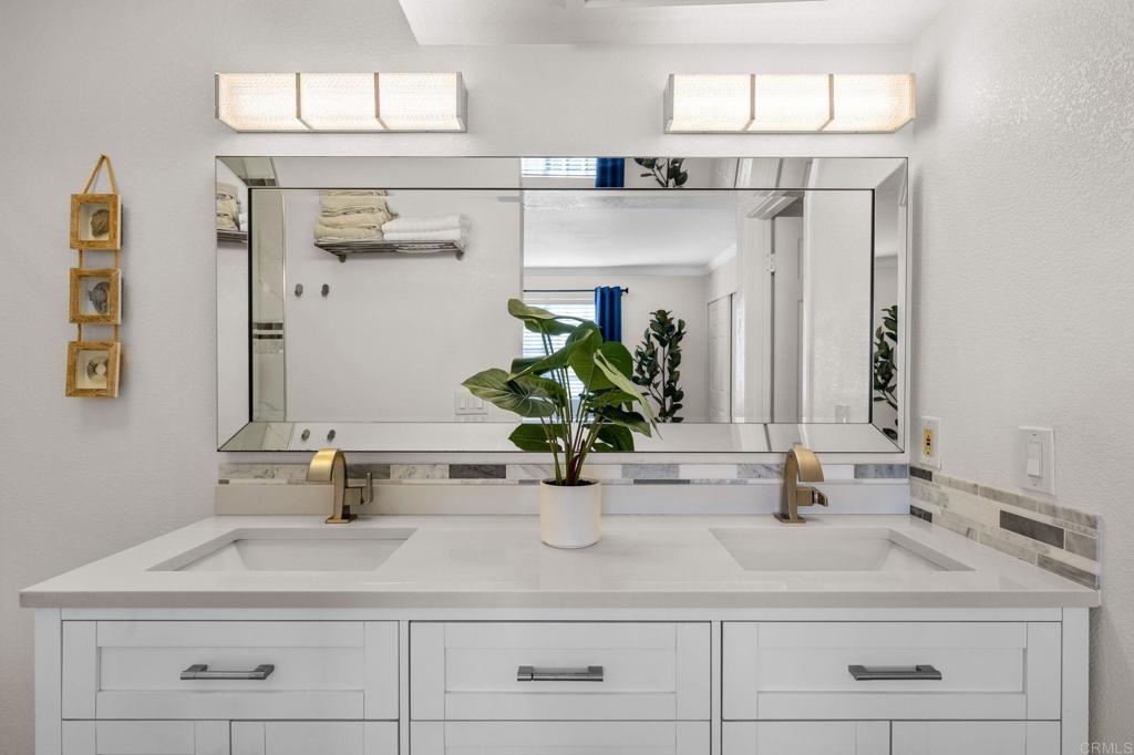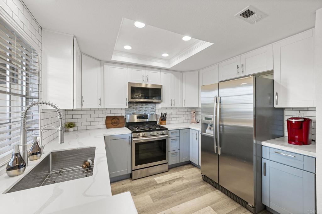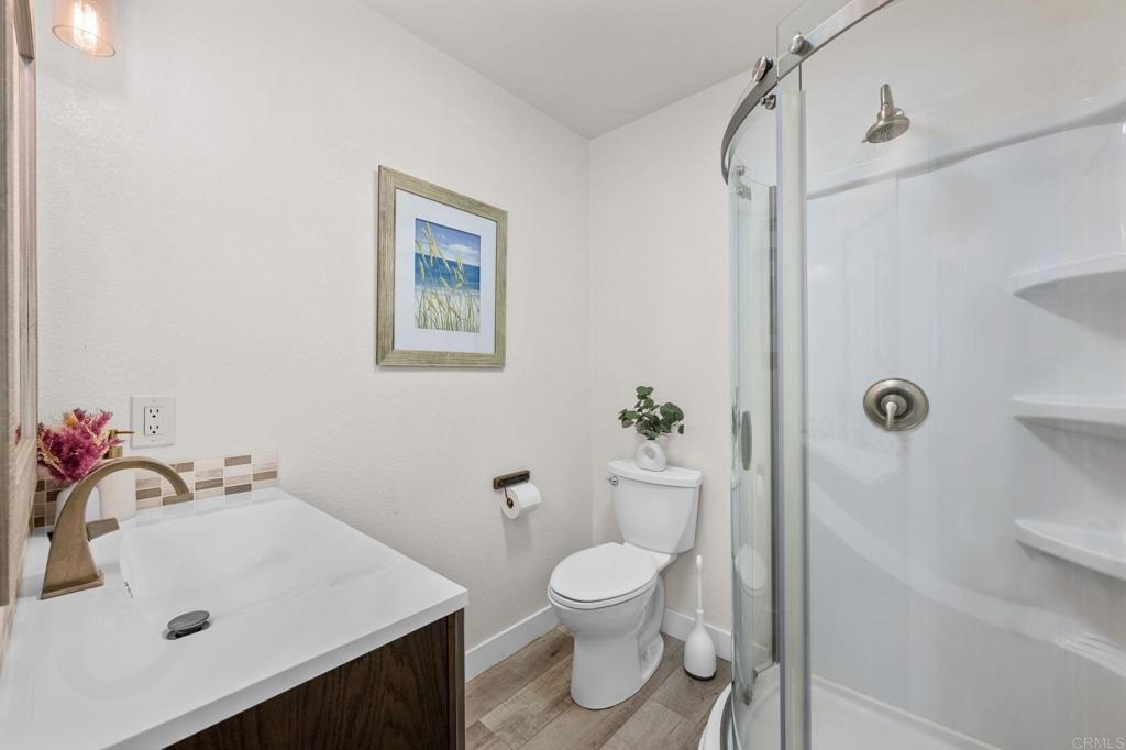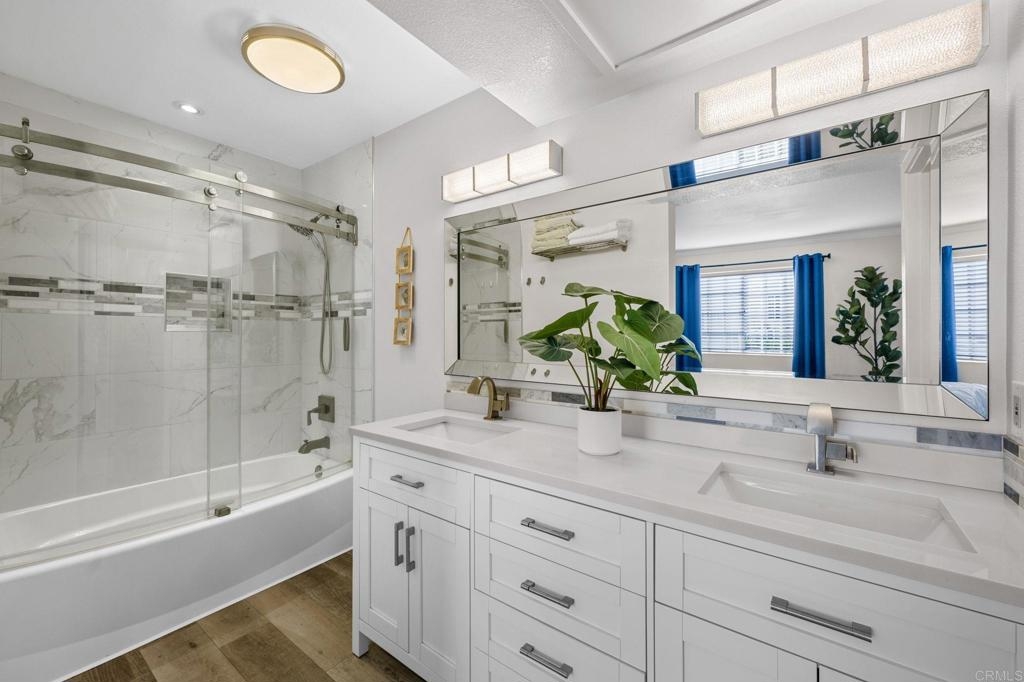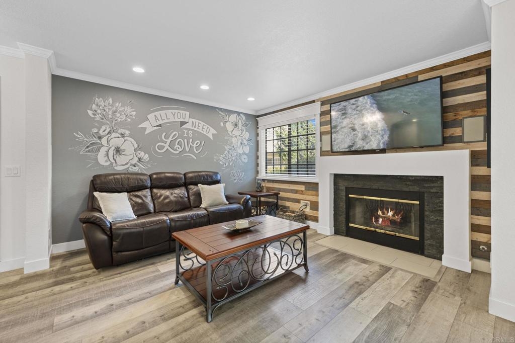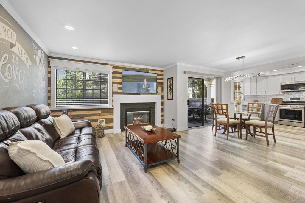 Welcome to Charlemont! This two bedroom, two full bathroom condo is a lower level end unit, offering privacy and style. The durable and stylish luxury vinyl plank flooring brightens up and enlarges the space, creating a seamless flow from room to room. Relax by the fireplace, updated with a stylish stone surround, or enjoy cooking in the fully remodeled kitchen, offering quartz countertops and tile backsplash. Each bedroom offers new closet doors, crown moulding, and plenty of space. The bathrooms have been customized to provide convenience and privacy. With an enclosed outdoor space, you can invite your guests for a barbeque, or enjoy the space yourself, with room for a small garden. Centrally located with quick access to HWY 78, Palomar Airport Rd, shopping and entertainment, and only 7 miles to the beach.