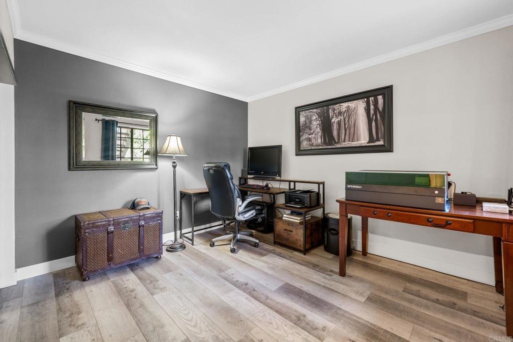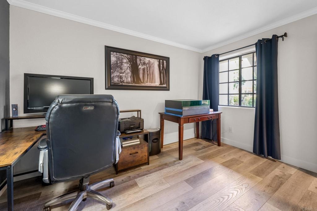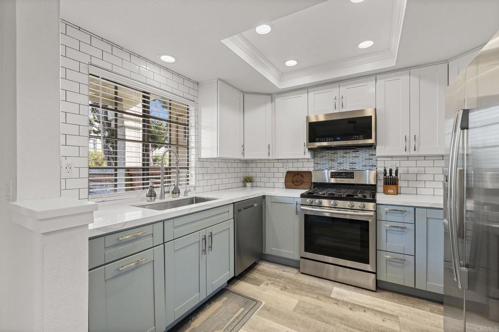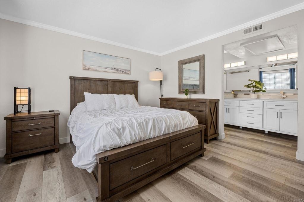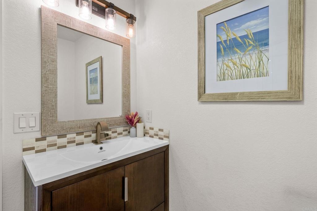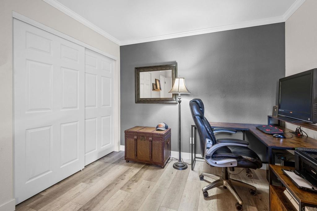 Welcome to Charlemont! This two bedroom, two full bathroom condo is a lower level end unit, offering privacy and style. The durable and stylish luxury vinyl plank flooring brightens up and enlarges the space, creating a seamless flow from room to room. Relax by the fireplace, updated with a stylish stone surround, or enjoy cooking in the fully remodeled kitchen, offering quartz countertops and tile backsplash. Each bedroom offers new closet doors, crown moulding, and plenty of space. The bathrooms have been customized to provide convenience and privacy. With an enclosed outdoor space, you can invite your guests for a barbeque, or enjoy the space yourself, with room for a small garden. Centrally located with quick access to HWY 78, Palomar Airport Rd, shopping and entertainment, and only 7 miles to the beach.